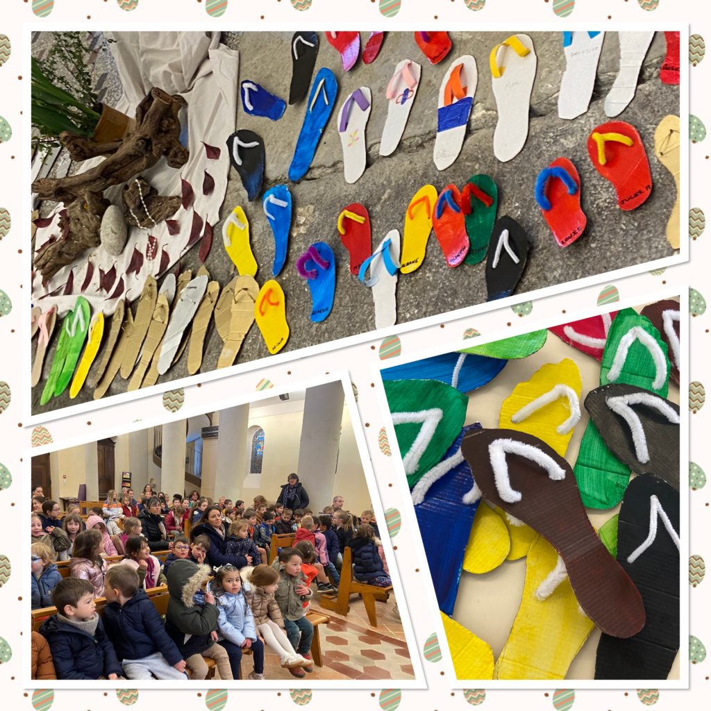 • Parce qu’elles font référence aux disciples d’Emmaüs (en sandales), étudiés pendant cette période. Dans leur histoire, deux personnes marchent sur un chemin et, en avançant, elles comprennent des choses importantes. Pendant le Carême, nous aussi, nous faisons un chemin pour réfléchir, grandir et progresser. Les tongs représentent ce chemin : les pas que chacun fait pour avancer, selon ses valeurs et ses efforts. On peut “faire grandir son cœur” en faisant un effort, en ayant envie de progresser, en faisant plus attention aux autres etc.